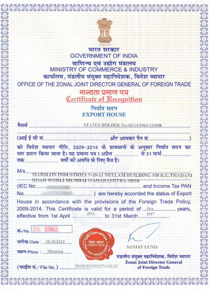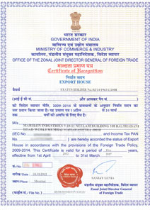 Marslon Industries is a Government of India recognized Export House certified by the Ministry of Commerce & Industry from the office of Zonal Joint Director General of Foreign Trade.